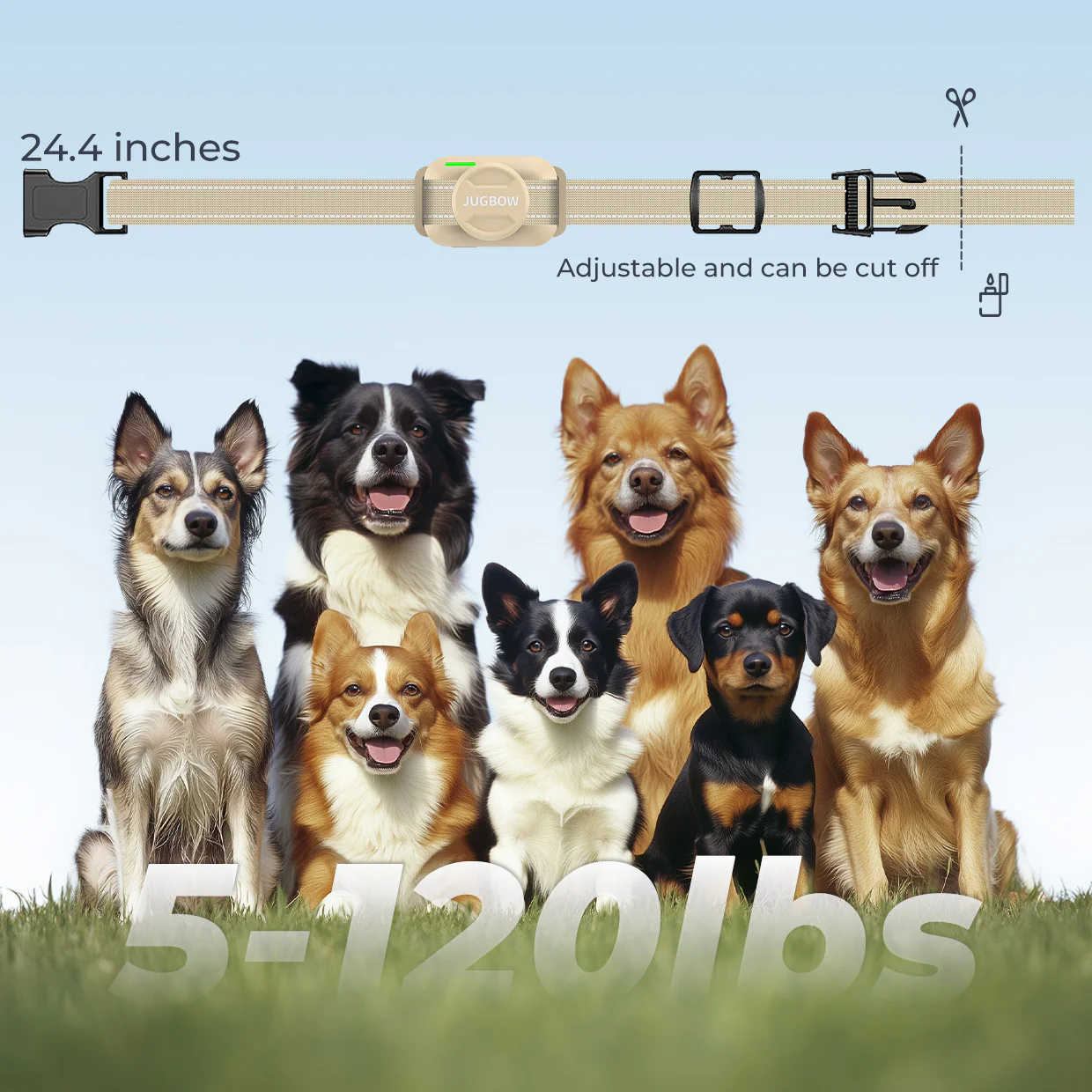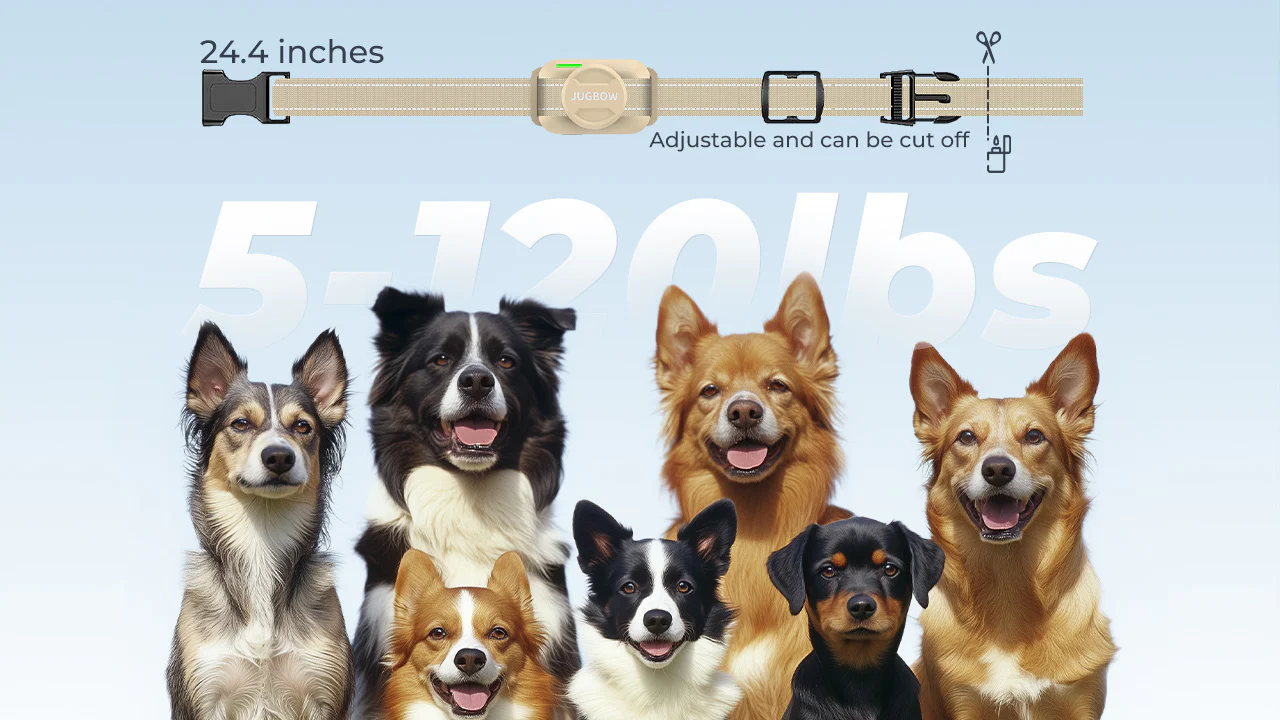 Adjustable collar suits necks 7.8-24.4 inches for dogs of all sizes.