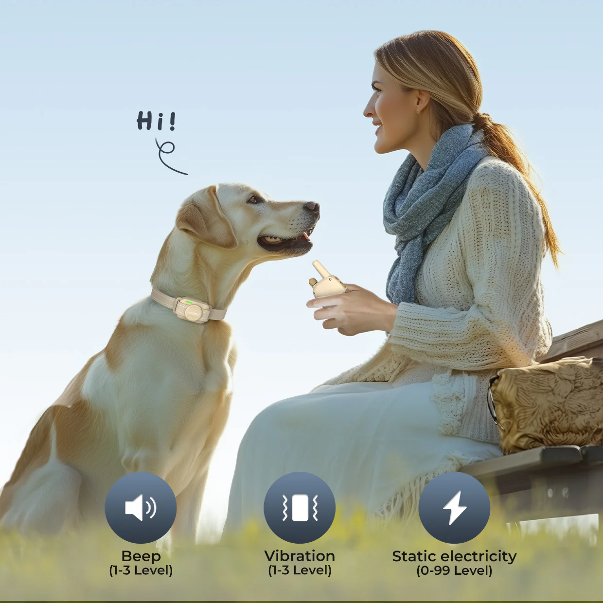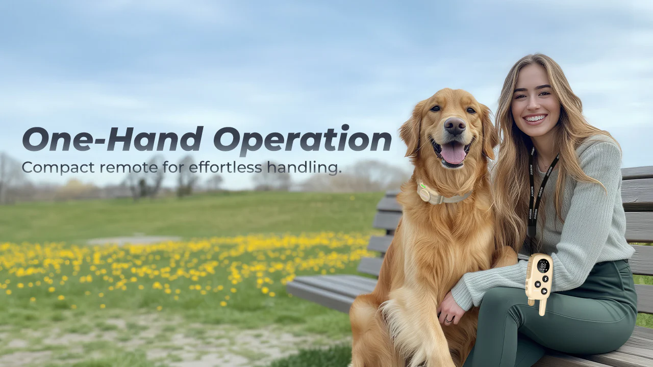 Beep, Vibration (1-3 levels), and Safe Static Shock (0-99 levels) for humane corrections.